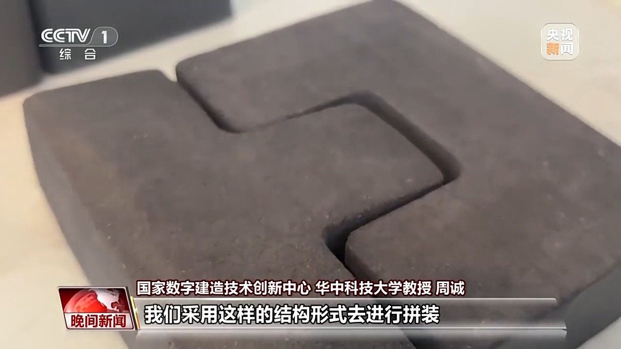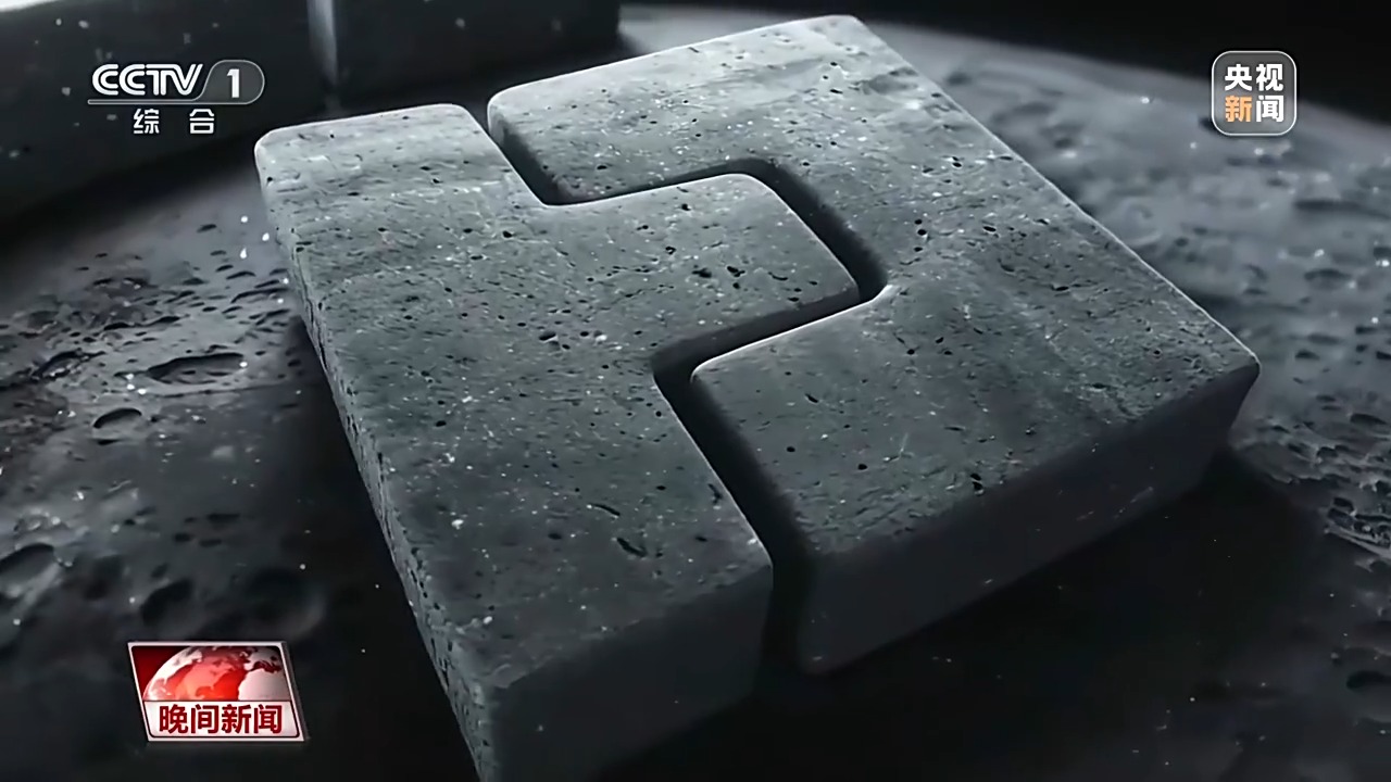 *國家數字建造技術創新中心 華中科技大學教授 周誠:*我們看到的這兩塊磚呈現的是榫卯結構,有利於在未來的月球基地的建造過程中,我們採用這樣的結構形式進行拼裝。
