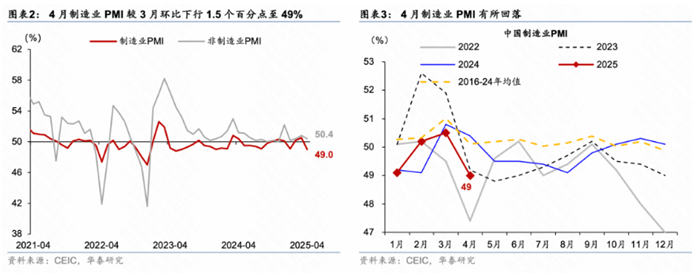 但也需注意到,4月製造業PMI較3月的50.5%回落至49.0%,低於季節性水平,主要受出口需求放緩的拖累,具體來看,生產指數回落2.8個百分點至49.8%,新訂單/新出口訂單指數亦分別從51.8%、49%下行至49.2%、44.7%,而高技術行業PMI明顯高於製造業整體水平,而裝備製造業、消費品行業和高耗能行業PMI景氣度有所回落。