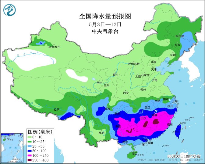 未來10天(5月3日-12日),江南中南部、華南中北部及貴州等地累計降水量有50~80毫米,其中江南南部、華南北部的部分地區有100~200毫米,局地超過300毫米;上述大部地區累計降水量較常年同期偏多2~7成,江南南部、華南北部部分地區偏多1~2倍,我國其餘大部地區降水偏少。