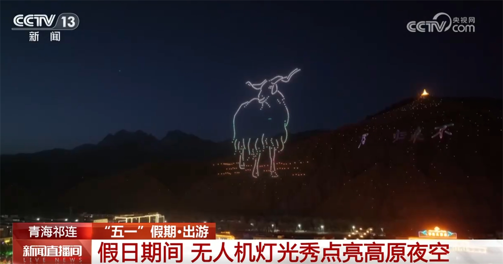 5月1日晚,青海省海北藏族自治州祁連縣卓爾山,無人機燈光秀精彩上演。500架無人機組成隊列,以“手型觸發山頂燈光”開場,並不斷變換隊形。既有“馬上望祁連,奇峯高插天”等描繪巍峨祁連山的詩句,也有雪豹、犛牛、藏羊等特色物種和“祁連9號公路”、卓爾山、八一冰川等地標性打卡點。在展現高原特色的同時,為當地居民和遊客帶來了科技與藝術融合的視覺盛宴。