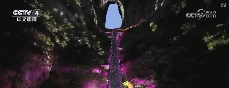 “五一”假期,湖南天門山景區以自然風光吸引中外遊客。隨着夜幕降臨,天門山山體被五彩燈光點亮,999級彩虹台階燈光流轉,遠看就像一道連通天地的彩虹橋,將千年奇觀天門洞裝點得更加巍峨壯觀。
