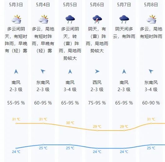 具體到深圳,據“深圳天氣”預報,3日晚到4日早晨深圳晴天到多雲,有短時陣雨,大家出門記得帶傘。5月3日~5月4日,深圳多雲,有短時陣雨或雷陣雨,早晚有輕霧,氣温24℃~31℃,午間體感較熱;5月5日~5月6日,受全省降雨過程影響,將出現雷陣雨,局地雨勢較大;展望5月7日 ~8日,大致多雲,多(雷)陣雨。