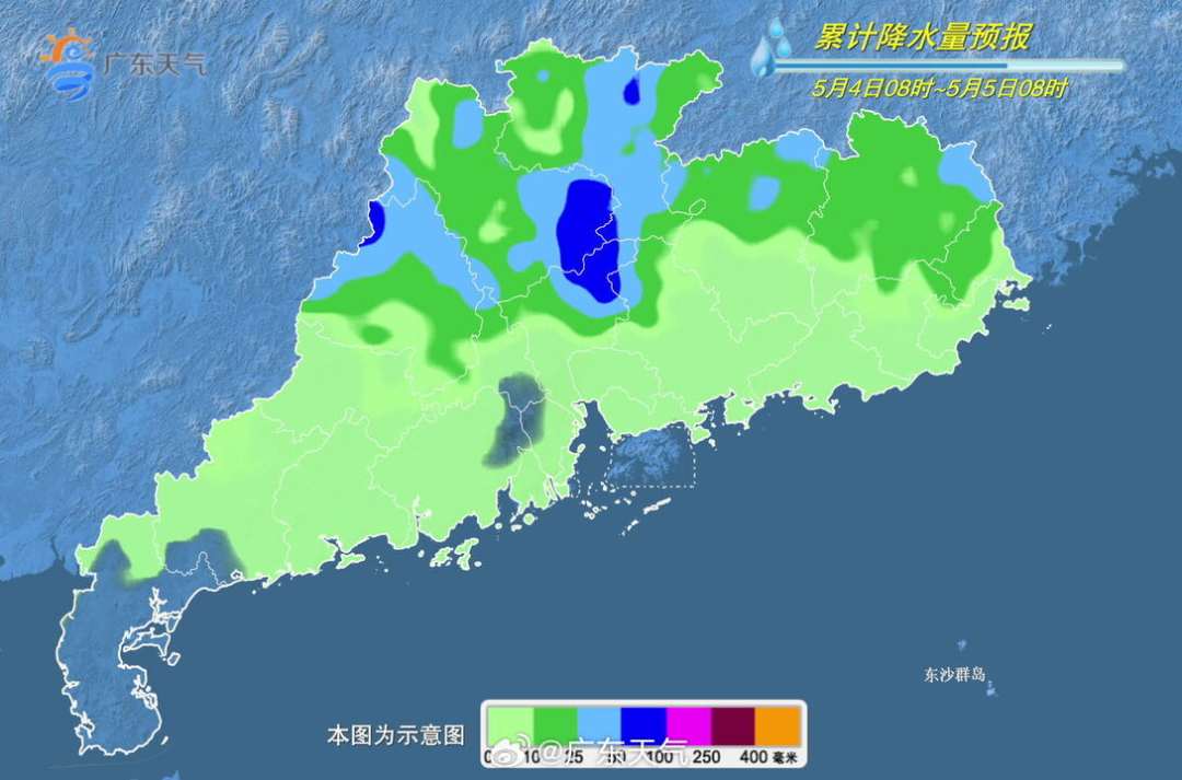 據“廣東天氣”消息,5月3日,粵西市縣多雲間陰天,其餘大部市縣多雲轉(雷)陣雨;5月4日 ~ 5月5日,粵北和珠江三角洲中北部市縣有大雨局部暴雨,其餘市縣有雷陣雨局部大雨,部分市縣將伴有8 ~9級的雷雨大風;5月5日 ~6日,廣東省自北向南有一次雷陣雨過程,局地雨勢較大。氣象部門提醒,需注意防範局地強降水、雷雨大風、雷電等強對流天氣帶來的安全風險。
