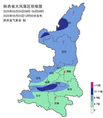 大風預報:**4日陝北、關中大部、秦嶺山區有5級左右(5.5~10.7m/s)偏北風,陣風7-9級(13.9~24.4m/s),局地10級(24.5~28.4m/s)以上。5**日陝北、關中北部及東部、秦嶺山區、商洛有4-5級(5.5~10.7m/s)偏北風,*陣風7-9(*13.9~24.4m/s)級,局地10級(24.5~28.4m/s)以上(圖1)。