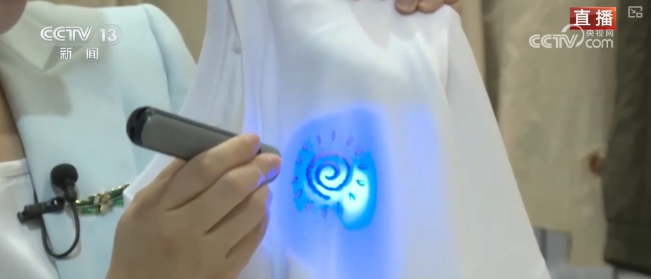 這件兒童T恤上的小太陽印花,採用“光感紗線”製作,摸起來並沒有不同,但是當用紫外線燈光照射後,這個印花就由白色變成紫色。兒童在户外活動時,可以提醒家長及時給孩子做好防曬。這樣的變色圖案也多了幾分童趣。