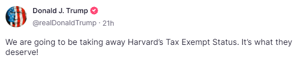△特朗普在社交媒體上表示將剝奪哈佛免税地位