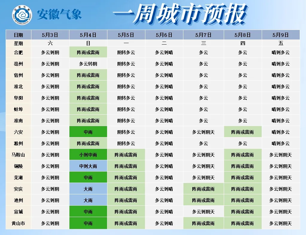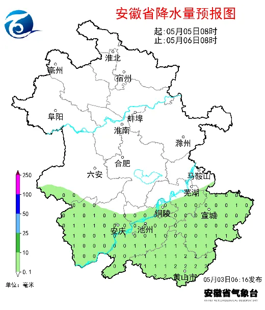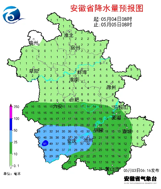 據安徽氣象最新預報顯示,5月4日夜裏至5日我省有一次較明顯降水過程,主要降水時段發生在4日夜裏,江淮之間南部和江南部分地區中到大雨,局部(安慶、銅陵市)暴雨(50~70毫米);7-8日淮河以南還有一次降水過程,降水主要集中在沿江江南地區;其餘時段全省以晴到多雲天氣為主。