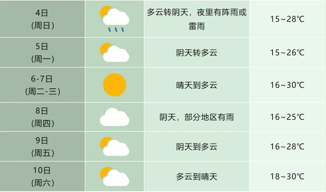 *4日(週日):*全省多雲轉陰天有陣雨或雷雨,其中江淮之間南部和江南部分地區中到大雨,局部暴雨。