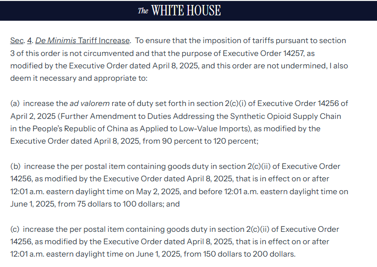 根據白宮4月9日發佈的公告,自5月2日起,對含有來自中國內地和香港的貨物,且價值等於或低於800美元的包裹,徵收相當於貨值120%或100美元的關税。