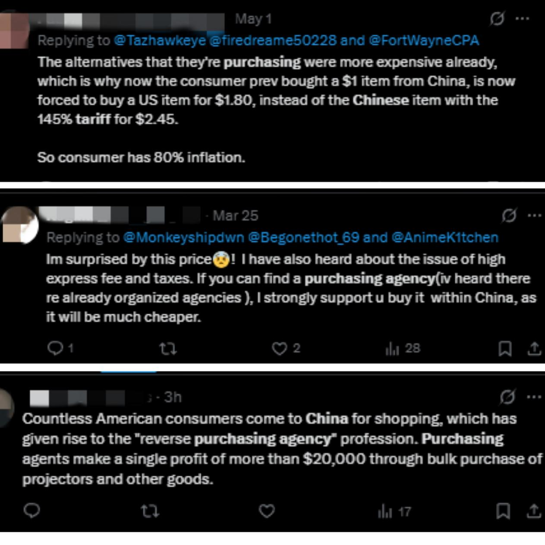 網友注意到“越來越多的美國消費者奔赴中國購物”,還有人認為“消費者承受着80%的通貨膨脹”“購買的替代產品更貴了”“如果能找到代購就好了”……