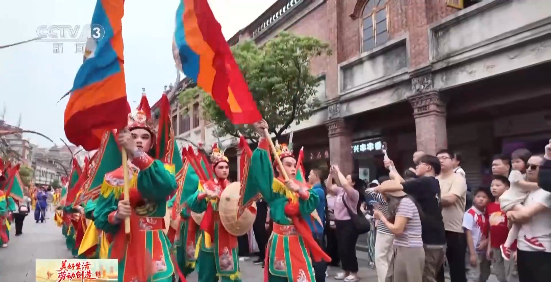 “五一”期間,非遺體驗遍佈泉州古城,比如在遊客必到的中山路,遊客就可以偶遇青獅、火鼎公婆等非遺快閃。
