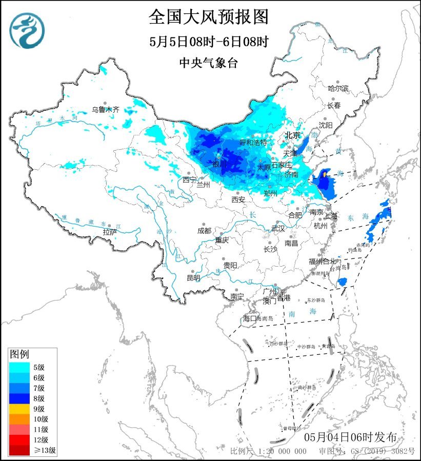 5月5日08時至6日08時,內蒙古中西部、寧夏、陝西中北部、山西大部、河北北部和西部、河南中北部、山東中西部、江蘇北部等地有5~7級、陣風8~10級的大風,黃海中西部和西南部將有7~8級、陣風9~10級的大風(見圖3)。