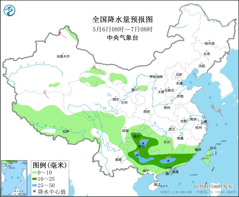 *中央氣象台5月4日06時繼續發佈暴雨藍色預警。*預計,5月4日08時至5日08時,貴州東南部、湖南中南部、江西東部和中南部、安徽西南部、福建西部、廣西北部、廣東北部以及四川盆地西南部等地部分地區有大到暴雨,其中,貴州東南部、廣西北部、湖南西南部和東部、江西中部等地局地有大暴雨(100~120毫米)。上述部分地區伴有短時強降水(最大小時降雨量20~40毫米,局地可超過50毫米),局地有雷暴大風等強對流天氣(見圖1)。