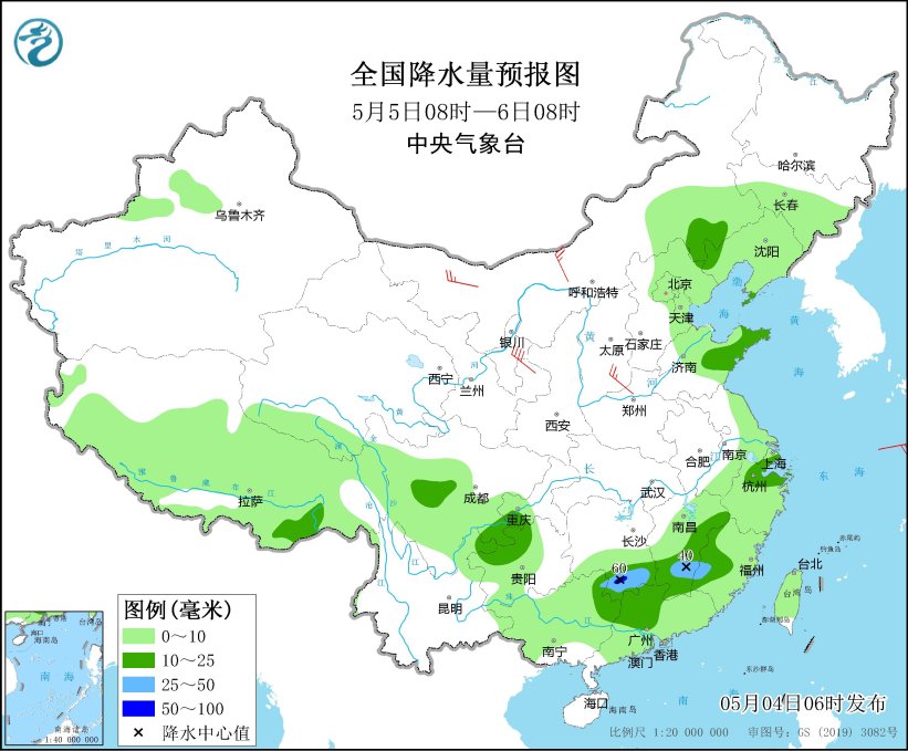 圖5 全國降水量預報圖(5月4日08時-5日08時)