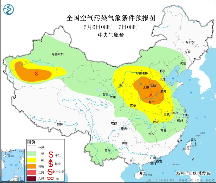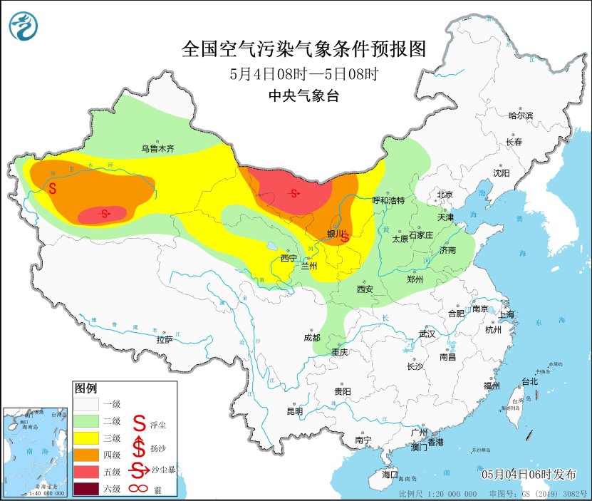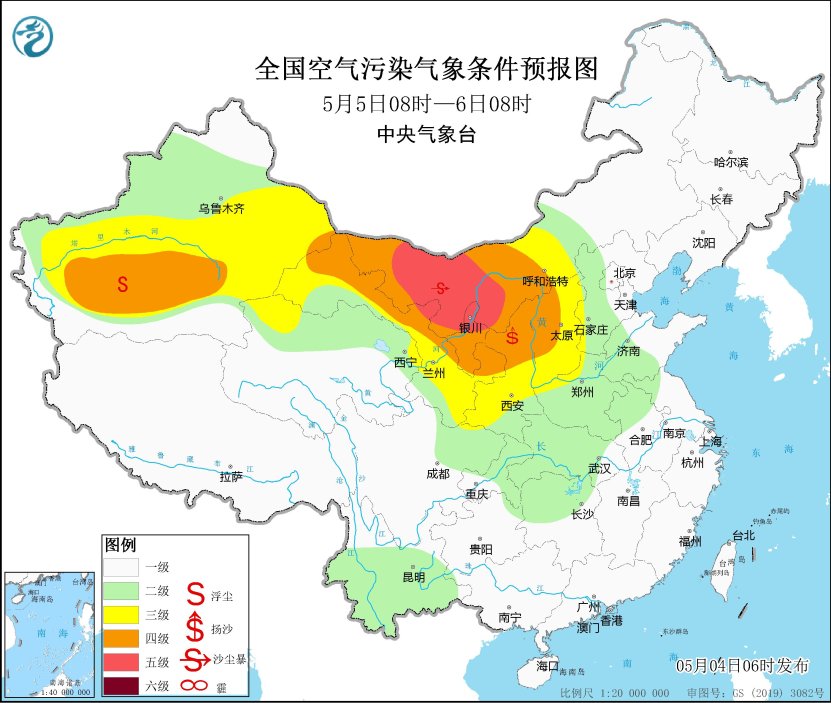 4日至6日,新疆南部和東部、內蒙古西部、青海北部和東部、西北地區東部、華北西部和南部、黃淮、江淮等地的部分地區有揚沙或浮塵天氣,其中,新疆南部、內蒙古西部、甘肅西部、寧夏北部等地的部分地區有沙塵暴,局部有強沙塵暴。中央氣象台於5月4日06時繼續發佈沙塵暴藍色預警。