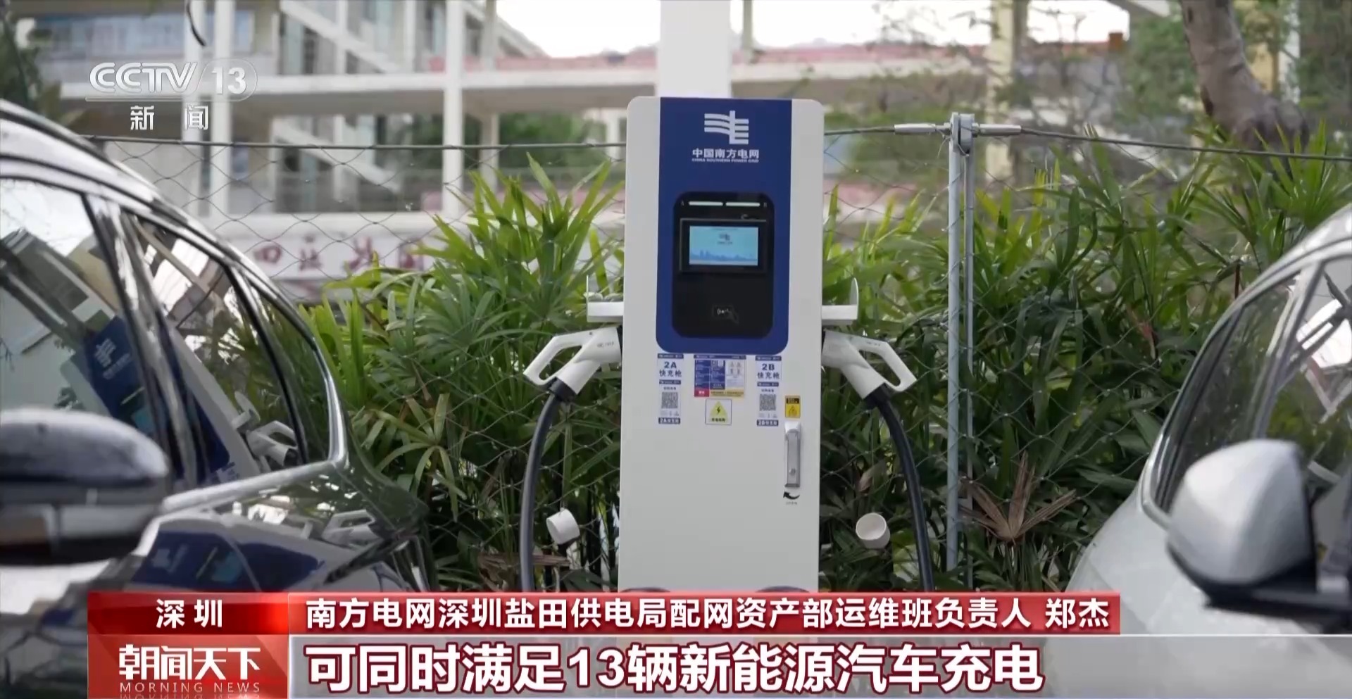*南方電網深圳鹽田供電局配網資產部運維班負責人 鄭傑:*園區內還配備快充、慢充、V2G(汽車對電網)等充電樁,可同時滿足13輛新能源汽車充電。