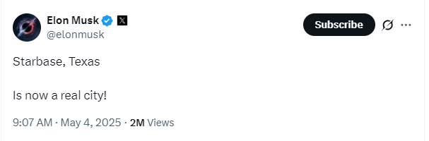 太空探索技術公司首席執行官埃隆·馬斯克在社交媒體發文:“得克薩斯的星艦基地,現在是一座真正的城市了!”。