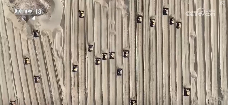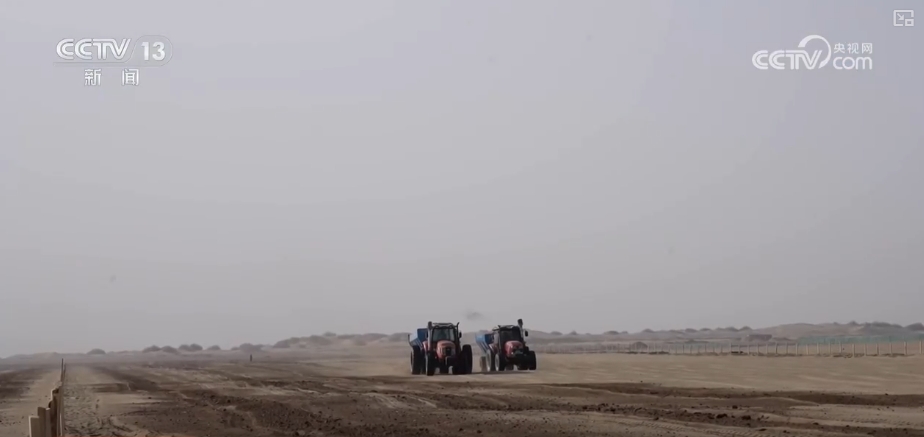 在作業現場,上百台裝載機、平地機在沙海中來回奔忙。原本丘壑縱橫的流動沙丘經過連續作業,逐漸變得平整,顯露出田壟的輪廓。