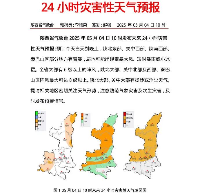 預計*今天白天到晚上,陝北東部、關中西部、陝南西部、秦巴山區部分地方有雷暴,局地可能出現雷暴大風、短時暴雨或小冰雹。全省大部有6級以上的陣風,陝北大部、關中大部有揚沙或浮塵天氣。*提請相關地區密切關注天氣形勢,注意防範氣象災害及次生災害,及時發佈預警信號。
