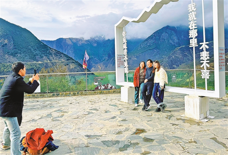 遊客在雅魯藏布江大拐彎觀景台拍照留念。記者 白瑪澤旺 攝