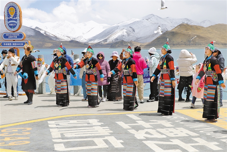 浪卡子縣各景區聚焦“文化+旅遊”深度融合,推出“文藝進景區”系列活動,觀景台上演民族歌舞盛宴,呈現“藏韻飛揚”的文化盛景。“遊客互動抽獎”“文明旅遊宣傳”等活動同步開展,羣眾性文藝演出將現場氛圍推向高潮,讓遊客全方位感受西藏優秀傳統文化的獨特魅力。