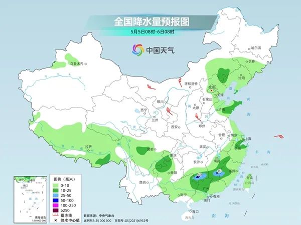 明天(5月5日),內蒙古東南部、山東半島、浙江東北部、上海、福建西部、江西東部和南部、湖南南部、四川盆地東南部、貴州西北部、廣西東北部、廣東北部等地部分地區有中到大雨,湖南南部等地局地有暴雨。