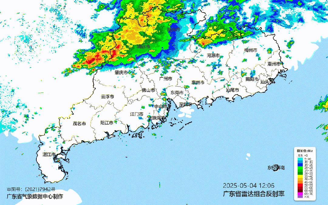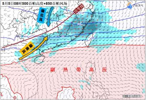 5月4日至5日,偏南氣流加強,切變線逐漸東移南壓,廣東的雷雨範圍將逐漸往南擴展,且雨勢有所加大,中北部市縣有大雨局部暴雨,並伴有強對流天氣。