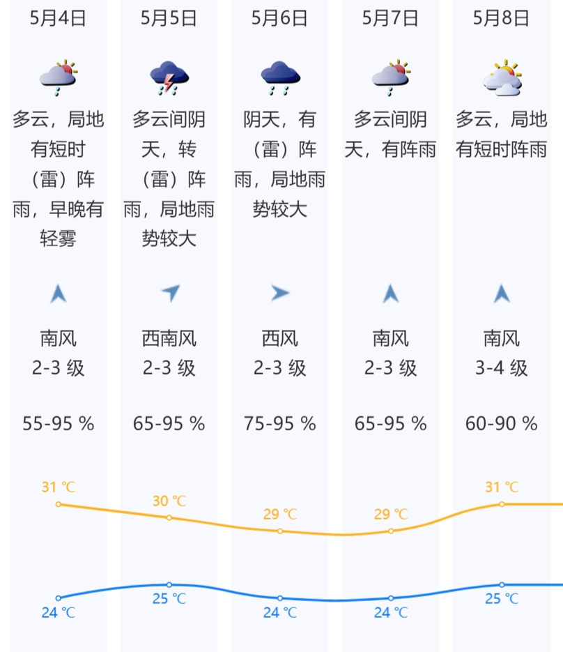 5月4日多雲,局地有短時(雷)陣雨,早晚有輕霧,氣温24-31℃,午間體感較熱;