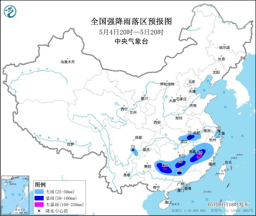 *中央氣象台5月4日18時繼續發佈暴雨藍色預警。*預計,5月4日20時至5日20時,貴州東南部、廣西東北部、湖南南部、廣東北部、江西中南部、福建北部、浙江西南部、湖北東部、安徽西南部、四川盆地西南部等地部分地區有大到暴雨,其中,江西東部、福建西北部、廣西東北部等地部分地區有大暴雨(100~130毫米)。上述部分地區伴有短時強降水(最大小時降雨量20~50毫米,局地可超過70毫米),局地有雷暴大風和冰雹等強對流天氣(見圖1)。