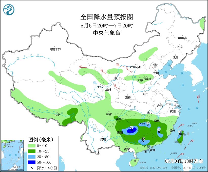 *5月6日20時至7日20時,*甘肅中部、內蒙古中部、山西中部、河北南部、西南地區北部和東部、江南大部、華南大部、台灣島等地部分地區有小到中雨,其中,貴州東南部、湖南西南部和東部、廣西北部、廣東西北部、江西東南部、福建西南部、台灣島中北部等地局地有大到暴雨(50~75毫米)。甘肅、寧夏、內蒙古西部等地部分地區有5~7級風,東海東部、台灣海峽、台灣以東洋麪、巴士海峽將有5~7級風、陣風8~9級(見圖6)。