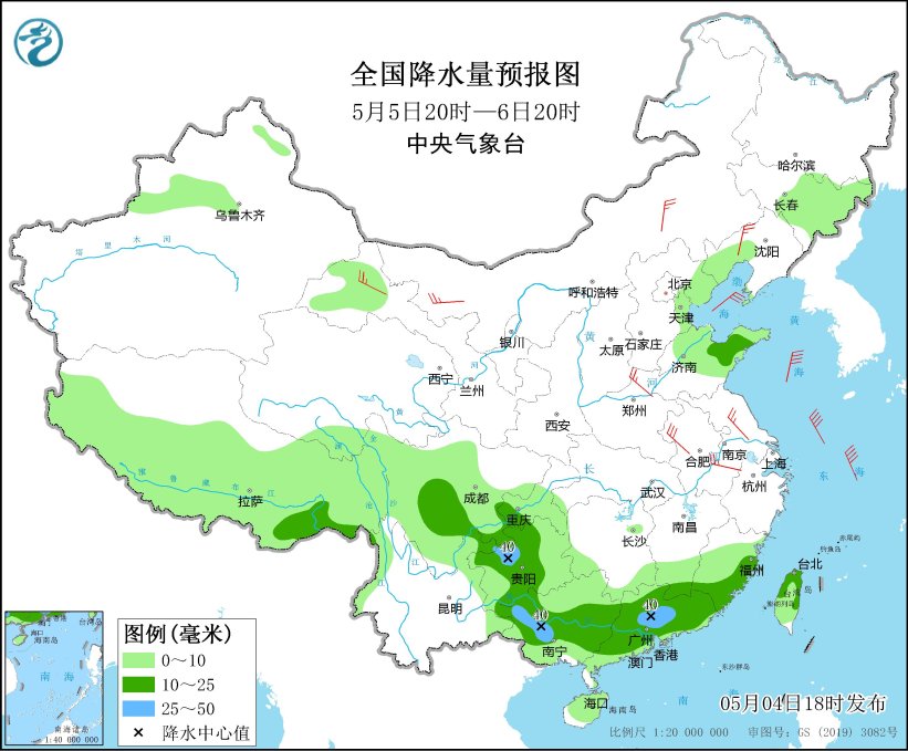 *5月5日20時至6日20時,*甘肅西北部、河北東部、天津、遼寧西部、吉林中東部、山東北部和東部、西南地區北部和東部、江南南部、華南大部、台灣島等地部分地區有小到中雨,其中,貴州北部、廣西西部、廣東中部等地局地有大雨(25~40毫米)。甘肅西北部、內蒙古西部和中東部、遼寧西部、黃淮、江淮等地部分地區有4~6級風,黃海南部海域、東海東北部海域將有7~8級風、陣風9~10級(見圖5)。