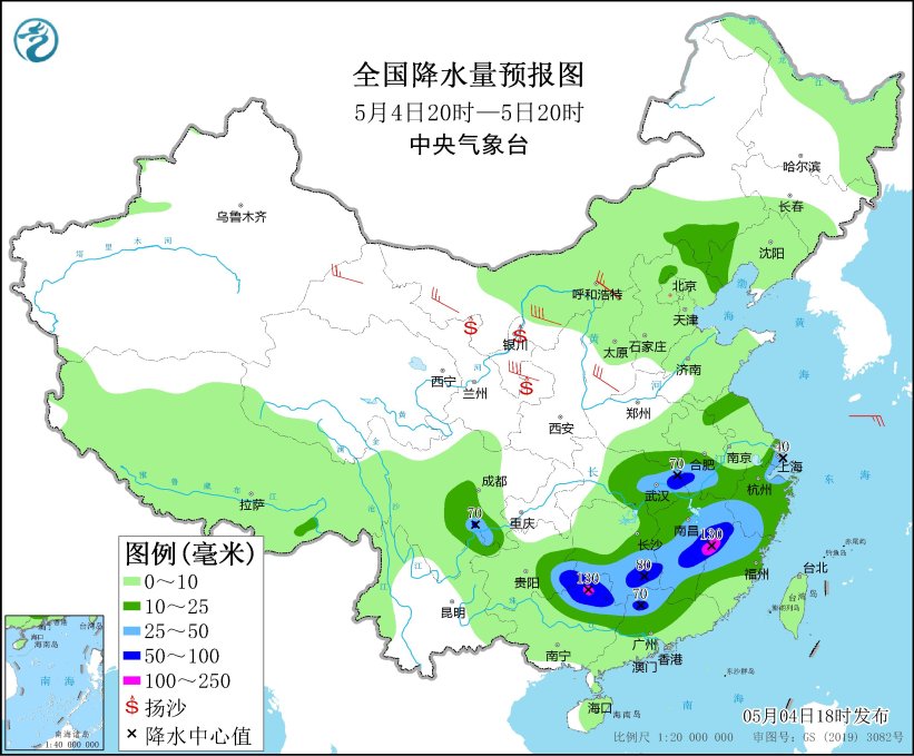 *5月4日20時至5日20時,*江南大部、華南北部、西南地區東部、江漢東部、江淮西部、黃淮東南部、內蒙古東南部、華北東北部等地部分地區有中到大雨,其中,安徽西南部、湖北東部、貴州東南部、廣西東北部、廣東北部、湖南南部、江西西南部和東部、福建西北部、四川盆地西南部等地部分地區有暴雨或大暴雨(100~130毫米)。新疆東部、內蒙古中西部、青海東部、西藏北部、甘肅河西、寧夏、陝西中北部、山西大部、河南西部等地有5~7級風,陣風8~10級(見圖4)。