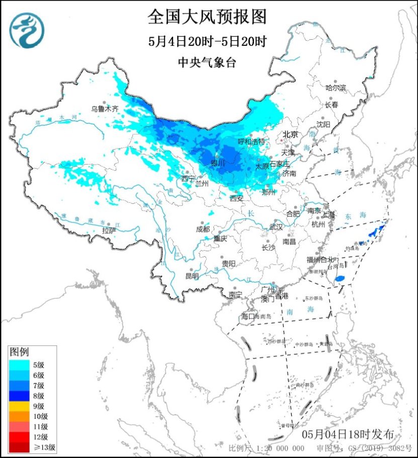 *中央氣象台5月4日18時繼續發佈大風藍色預警:*預計,5月4日20時至5日20時,新疆東部、內蒙古中西部、青海東部、西藏北部、甘肅河西、寧夏、陝西中北部、山西大部、河南西部等地有5~7級風,陣風8~10級、局地11級(見圖2)。