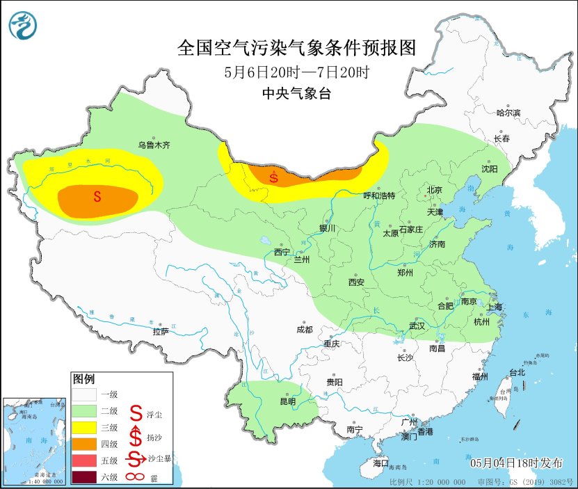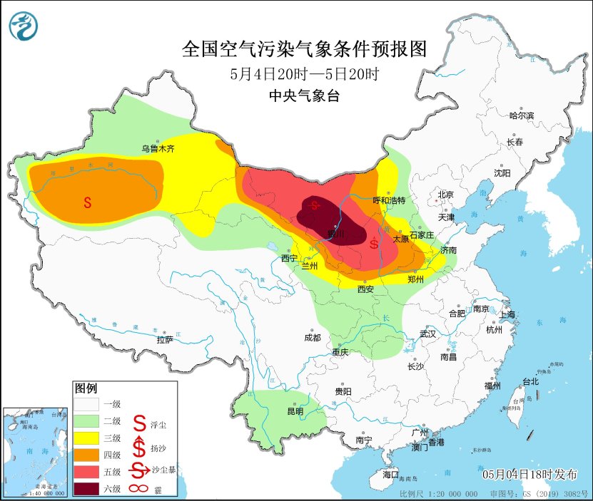 4日夜間至6日,新疆南疆盆地、內蒙古中西部、西北地區東部、華北南部、黃淮、江淮等地的部分地區有揚沙或浮塵天氣,其中,新疆南疆盆地、內蒙古中西部、甘肅西部、寧夏、陝西西北部等地的部分地區有沙塵暴,局部有強沙塵暴。中央氣象台於**5月4日18時繼續發佈沙塵暴藍色預警。