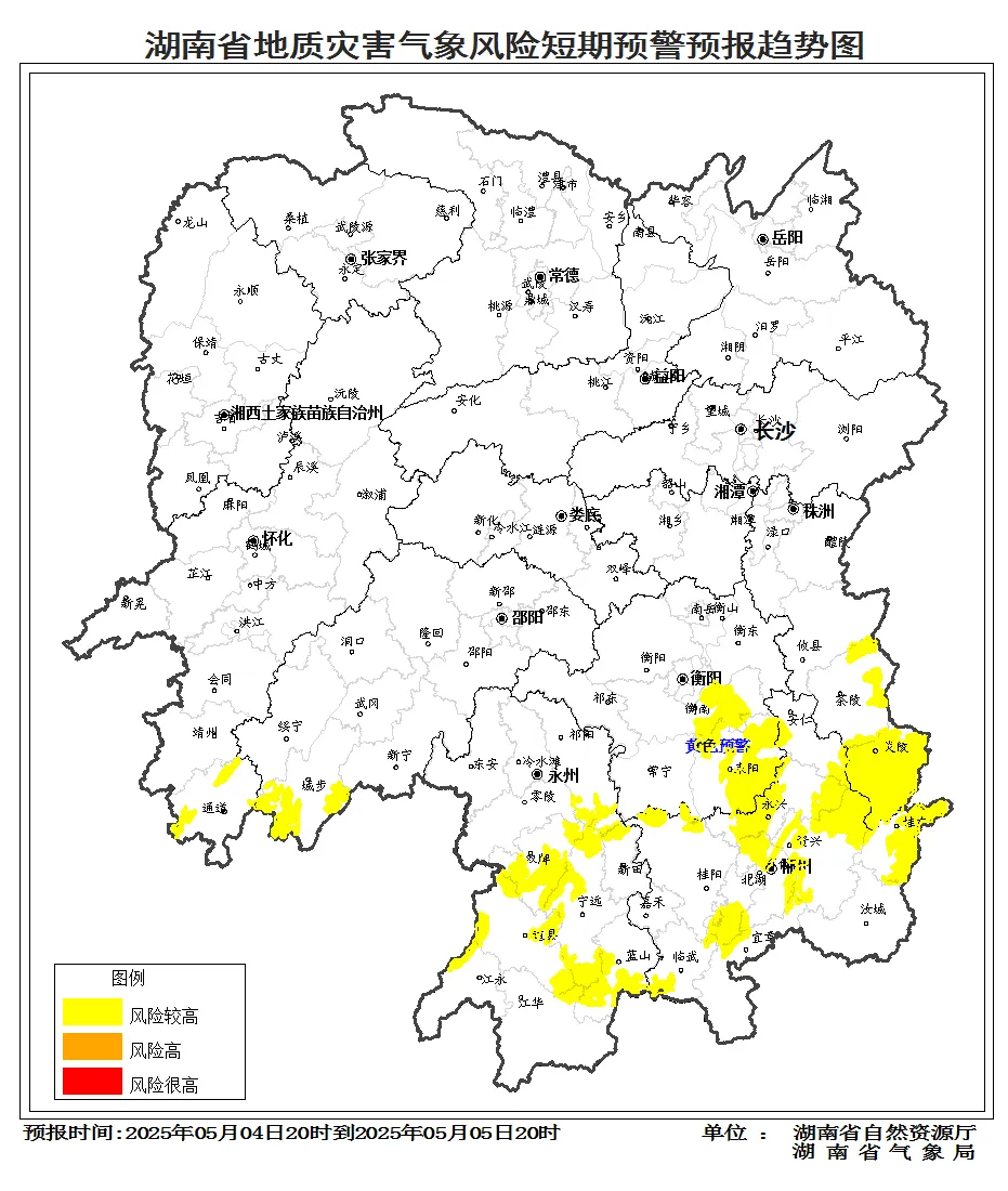 根據地質災害成災規律和孕災條件,結合2025年5月4日 短期氣象預報情況,省自然資源廳與省氣象局聯合會商得出如下結論:自5月4日20:00至5日20:00,受降雨影響,湘中以南的株洲、衡陽、邵陽、郴州、永州、懷化等市州山地丘陵區發生突發性地質災害風險較高黃色預警。