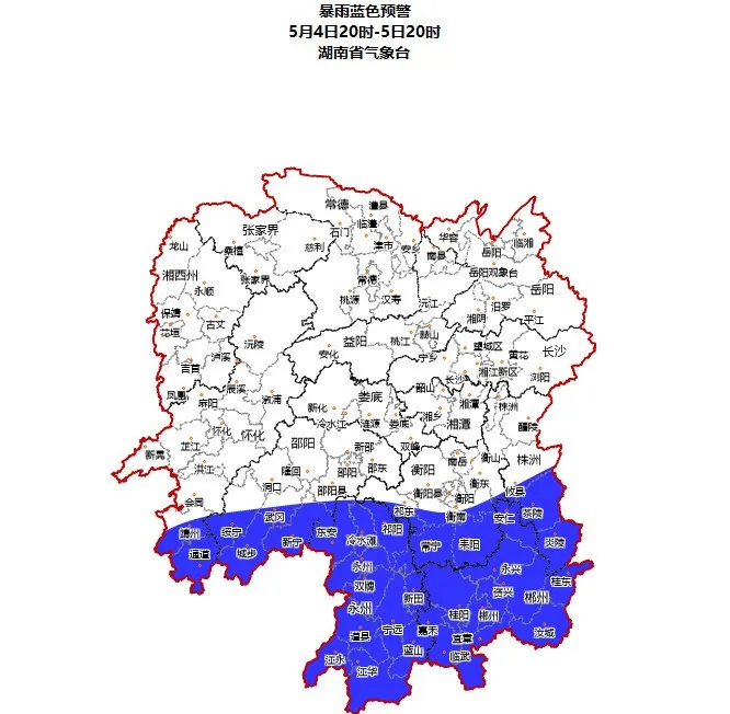 湖南省氣象台05月04日16時發佈暴雨藍色預警: