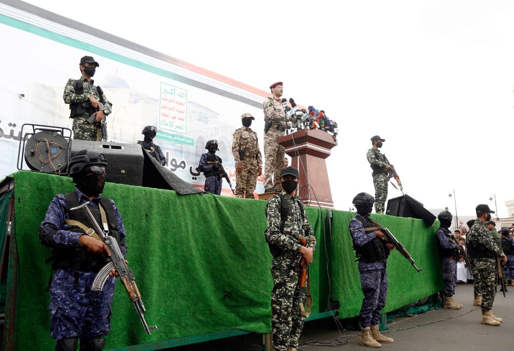 5月2日,也門胡塞武裝發言人葉海亞·薩雷亞(上右二)在首都薩那發表講話。新華社發(穆罕默德·穆罕默德攝)