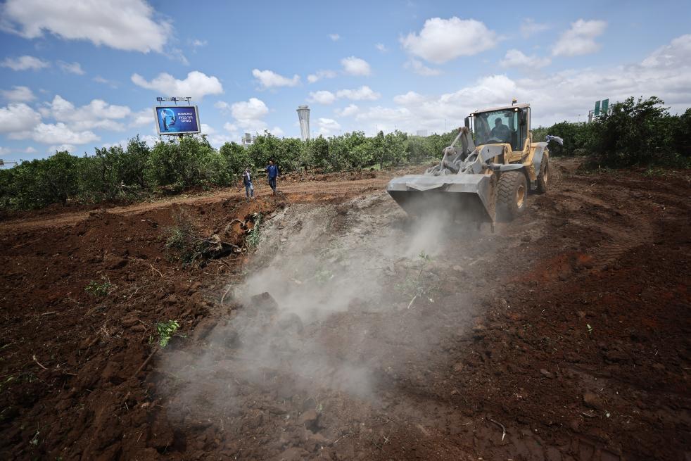 5月4日,在以色列特拉維夫本-古裏安國際機場附近,工作人員清理導彈襲擊現場。新華社發(賈馬爾·阿瓦德攝)