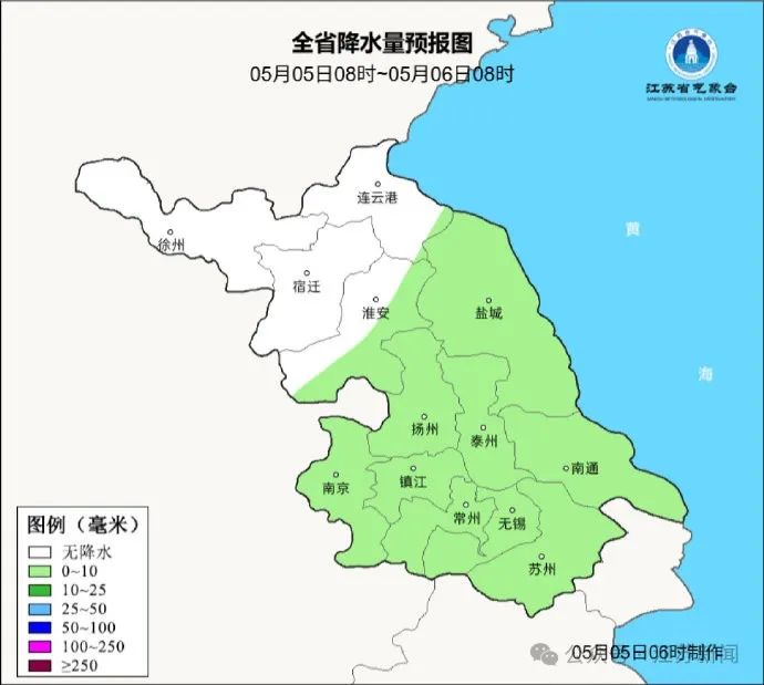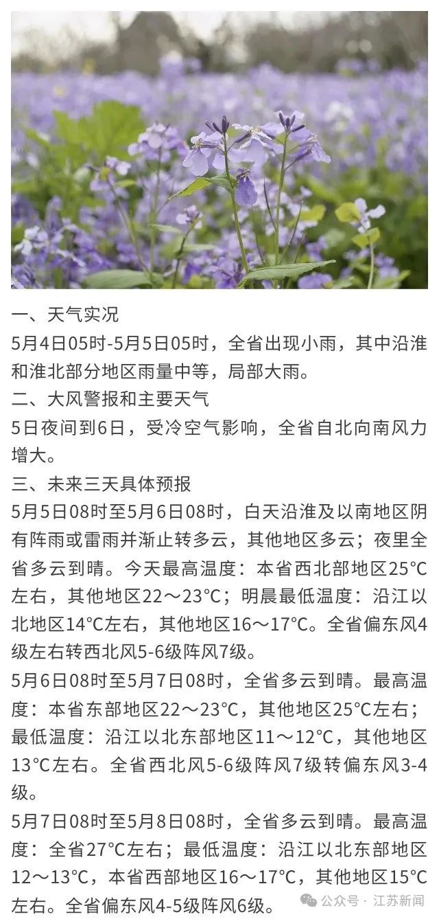 5月5日08時至5月6日08時,白天沿淮及以南地區陰有陣雨或雷雨並漸止轉多雲,其他地區多雲;夜裏全省多雲到晴。