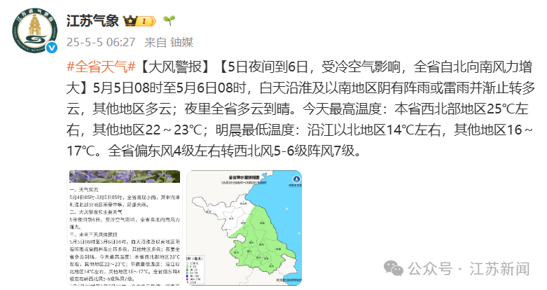 江蘇氣象發佈大風警報:5日夜間到6日,受冷空氣影響,全省自北向南風力增大。