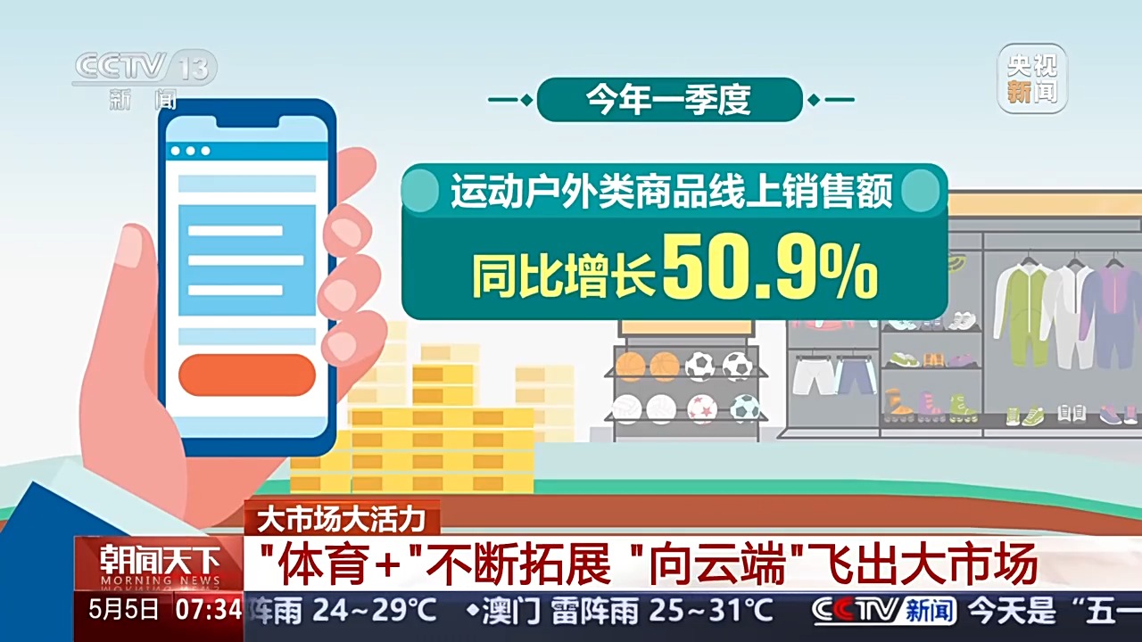 不只是空中運動飛出大市場,眼下,體育消費已成為拉動內需、促進經濟增長的關鍵引擎。數據顯示,今年一季度,運動户外類商品線上銷售額同比增長50.9%,其中運動褲、運動夾克等細分品類同比增長分別達2.7倍、2.9倍,千元以上衝鋒衣銷售額快速增長。