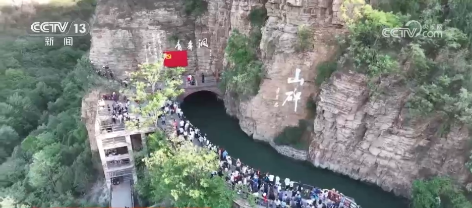 在河南林州市紅旗渠景區,來自全國各地的旅遊團、研學團隊、自駕人羣紛至沓來。遊客們行走在不足兩米寬的渠牆之上,抬頭便是陡立的峭壁,俯首就是數丈高的懸崖。沿着渠岸一路行進,仰望巍峨聳立的太行山,目睹修建在懸崖峭壁間的紅旗渠。