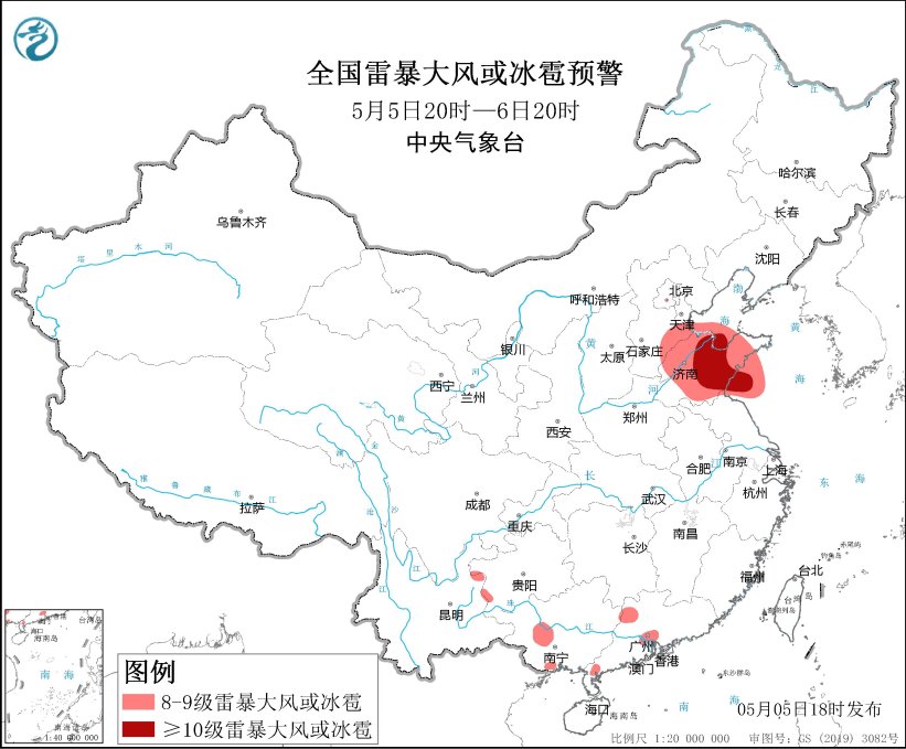 預計5月5日20時至6日20時,華北地區東南部、西南地區東南部、華南西部和南部等地的部分地區將有8級以上雷暴大風或冰雹天氣,其中,山東中東部等地的部分地區將有10級以上雷暴大風;華南地區中部、西南地區東南部等地的部分地區將有小時雨量大於20毫米的短時強降水天氣,其中,華南中部最大小時雨量可達50毫米以上。