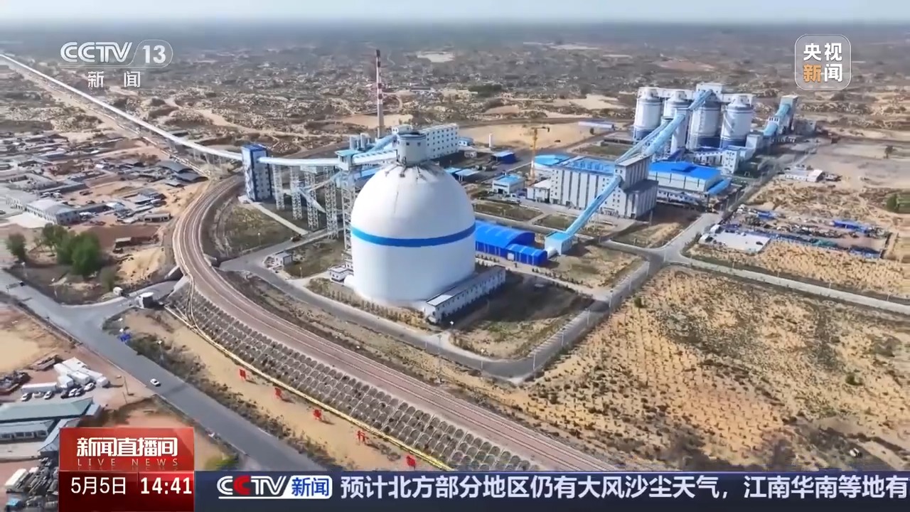 *總枱央視記者 古峻嶺:*你能猜到嗎,這個巨大的筒倉是用來幹嗎的?我現在是在亞洲最大氣膜儲煤倉的頂部。它的高度超過65米,直徑達66米,可儲煤10萬噸,儲煤量相當於三四個傳統的儲煤倉,可大幅節約佔地。按一節車皮裝載70噸煤計算,這一個氣膜倉就可以儲存1400多節車皮的煤炭。