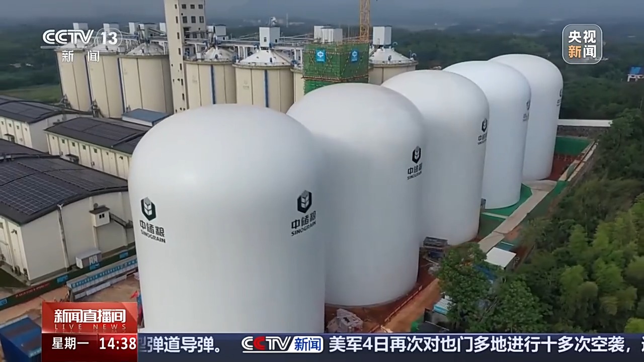 隨着最後一座氣膜倉充氣成型,5座白色的糧倉並排佇立。每座直徑24米、高達33米,一座倉就可儲糧9000噸,可以滿足2300萬人一天的口糧,標誌着我國糧食倉儲設施的迭代升級。