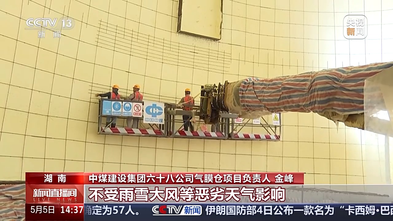*中煤建設集團六十八公司氣膜倉項目負責人 金峯:*氣膜倉的保温層和鋼筋混凝土結構層都是在充氣成型的氣膜內施工建設的,完全不受雨雪大風等惡劣天氣影響,傳統需要上百人施工,現在只需要18人就可以了。和上一代淺圓倉相比,施工週期縮短四分之一。