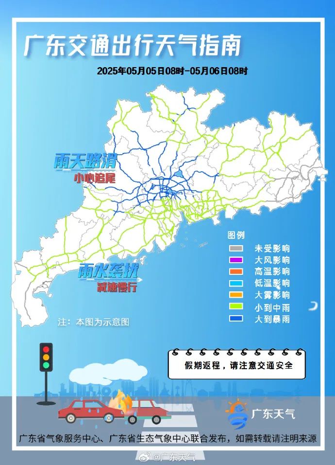 珠三角局部暴雨對行車安全有較大影響。粵北局部暴雨對行車安全有較大影響。