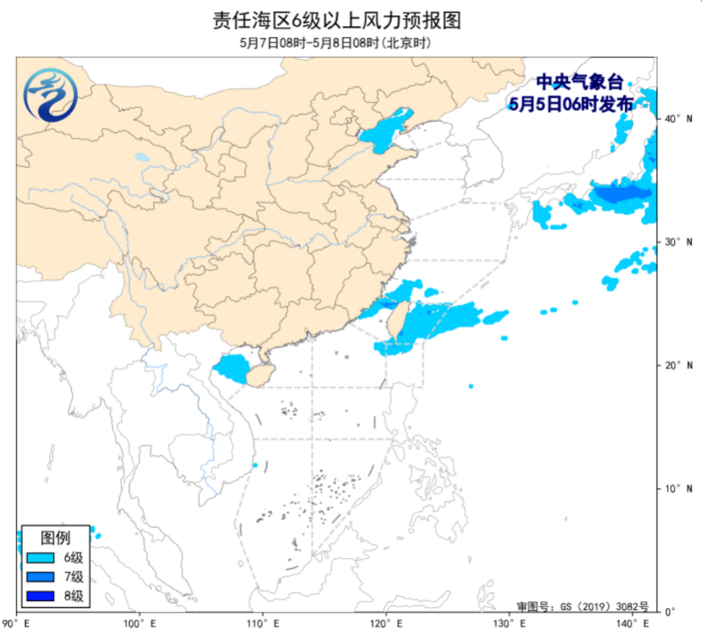 7日08時至8日08時,渤海、北部灣將有4~6級、陣風7級的偏南風,台灣海峽、台灣以東洋麪、巴士海峽將有5~6級、陣風7級的偏東到東北風。