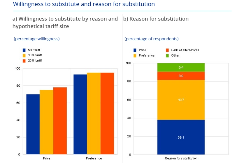 歐洲央行在4月底的博文中還提到,通常情況下,關税對消費者的影響程度取決於受影響產品和服務的需求價格彈性,即如果價格上漲,消費者可能會轉向更便宜的替代品。然而,近期美國的關税可能會導致更廣泛的偏好轉變,使歐洲人完全放棄美國產品和品牌,不論價格如何變化。