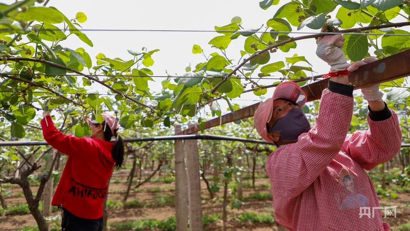 央廣網寶雞5月3日消息 眼下,在陝西省寶雞市眉縣金渠鎮寧渠村的獼猴桃種植示範園內,果農們正在獼猴桃園子裏忙碌着,以致富道路為畫軸,一幅果園忙碌的圖景在秦嶺北麓徐徐展開。
